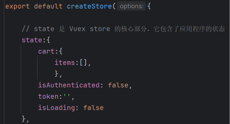 2. 定义 State:在 Vuex 的 state 中定义购物车中的商品列表。