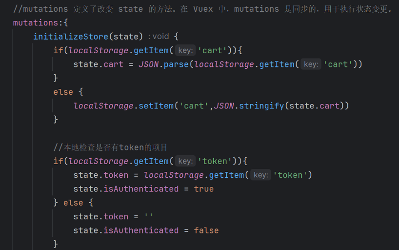 initializeStore:在应用启动时,检查本地存储(localStorage)中是否存在购物车数据(cart)。如果存在,则将其解析并设置到 Vuex 的 state.cart 中;如果不存在,则将初始的空购物车数据存储到本地存储中。