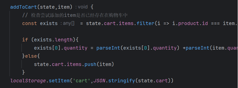 addToCart:接收一个商品项(item),检查该商品是否已经存在于购物车中。如果存在,则增加该商品的数量;如果不存在,则将该商品添加到购物车中。最后,更新本地存储中的购物车数据。