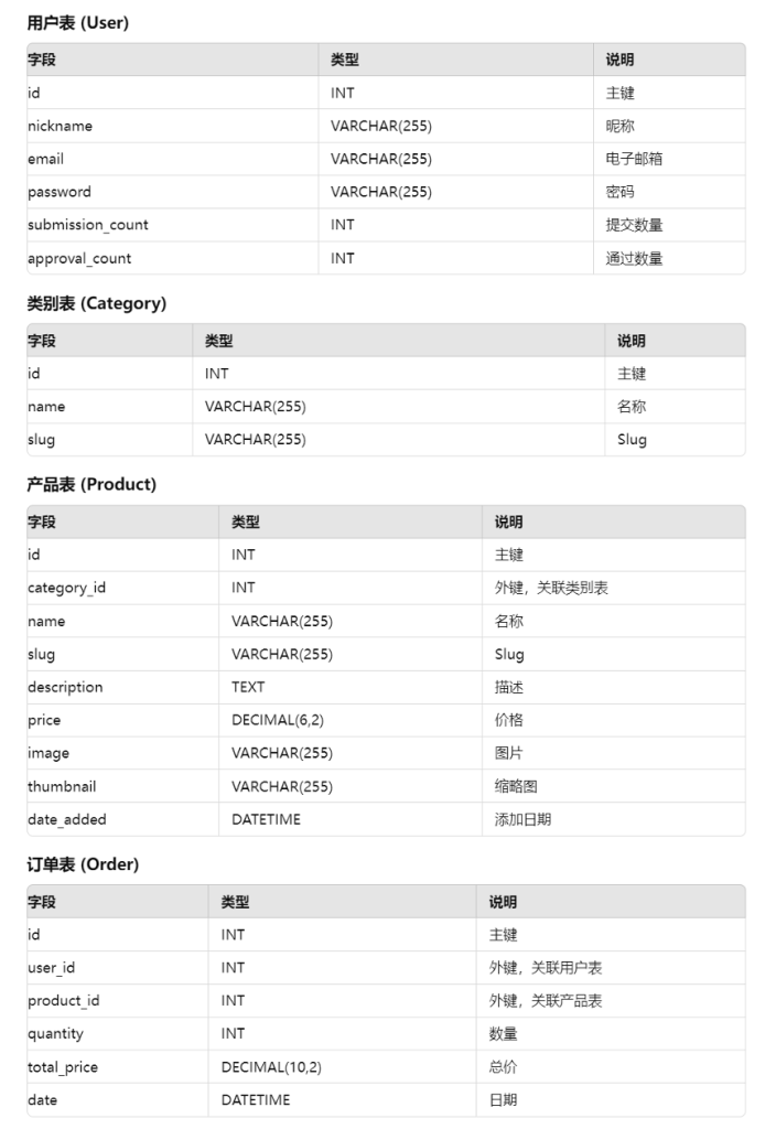 Product: { id (主键), name, slug, description, price, image, thumbnail, date_added,  category_id (外键)}