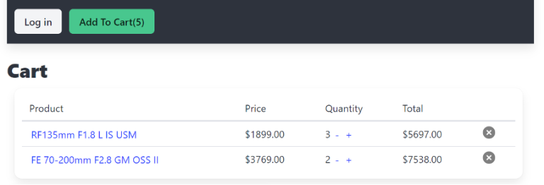 • 在组件中使用 Vuex 状态,展示购物车中的商品和总数量。